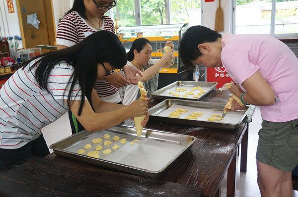 10點(diǎn)30分,活動(dòng)的第二環(huán)節(jié)——“DIY卷花曲奇”,誠(chéng)邀驛站烘焙坊導(dǎo)師為大家傳授制作卷花曲奇的技藝,大家聚精會(huì)神認(rèn)真的聽(tīng)著,怕遺漏其中一個(gè)環(huán)節(jié)就無(wú)法完成美味的曲奇。大家都摩拳擦掌準(zhǔn)本大展身手,活動(dòng)開(kāi)始后,其中攪拌黃油的環(huán)節(jié),組員的姿勢(shì)可是層出不窮,更是有組員被譽(yù)為攪拌戰(zhàn)斗機(jī),快速的攪拌黃油,遙遙領(lǐng)先其他組員。完成前期的材料準(zhǔn)備后,大家開(kāi)始卷花曲奇,組員各具風(fēng)采卷不各種各樣不同花市的曲奇,仿佛點(diǎn)心大賽一樣。其中一位義工通過(guò)卷出“I LOVE U”送給太太表達(dá)自己的愛(ài)意。