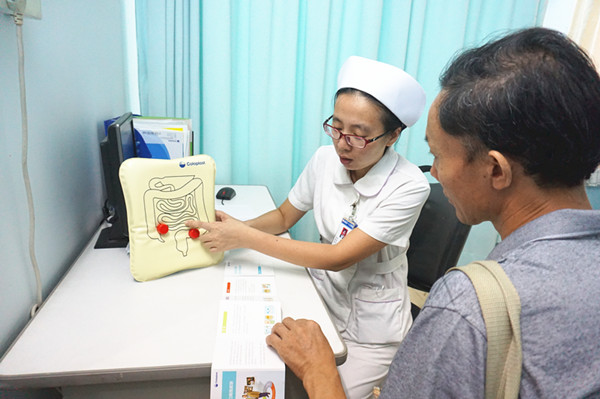 造口傷口??谱o(hù)士陳玲耐心為患者講解有關(guān)造口方面的注意事項(xiàng)。