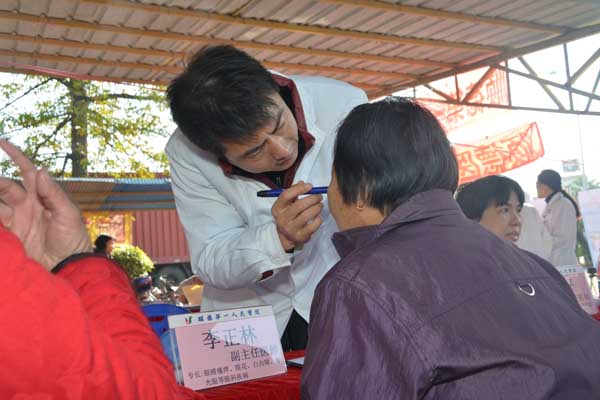 知道我院的專家要來義診,許多群眾一大早就等候在義診攤前。專家教授剛坐在診臺前,等候在那里的群眾就圍了過來,把義診臺圍了個水泄不通。