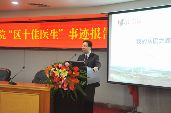 會上,胡允兆副院長首先宣讀了區(qū)十佳醫(yī)生和優(yōu)秀醫(yī)生的表彰文件,并親自為朱達(dá)堅等十佳醫(yī)生和優(yōu)秀醫(yī)生頒發(fā)獎牌和證書。隨后參會人員現(xiàn)場觀看了十佳醫(yī)生的事跡微電影宣傳片,兩位醫(yī)生分別用“生命之手”和“生命守護者”形象地詮釋了醫(yī)生這個職業(yè)的意義。接著,左六二和朱達(dá)堅兩位十佳醫(yī)生分別從自己的學(xué)習(xí)成長經(jīng)歷、工作感悟、從醫(yī)心路歷程以及團隊建設(shè)等方面和在場醫(yī)務(wù)人員分享他們從醫(yī)多年的體會,并與在場人員共勉,鼓勵年輕醫(yī)生要擺好自己的位置,融入醫(yī)院團隊,堅守醫(yī)療事業(yè)崗位,做生命的守護者。