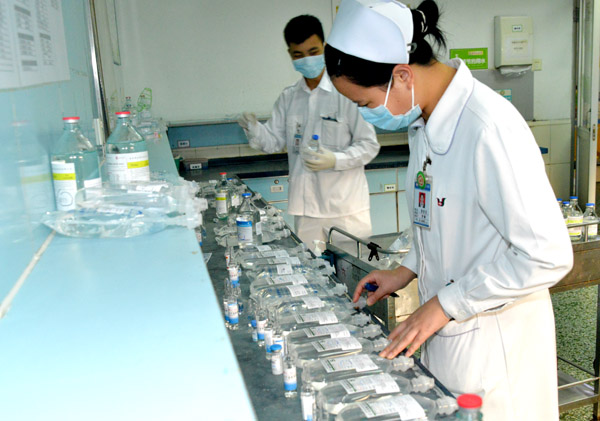 護(hù)士在認(rèn)真核對(duì)治療用藥。