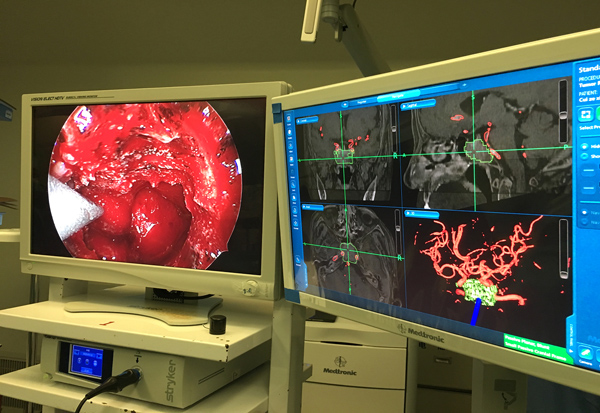 神經(jīng)導(dǎo)航系統(tǒng)顯示精確的顱內(nèi)掃描影像。