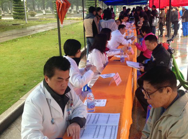 義診時(shí),天空下著大雨,來自各醫(yī)院的專家們,冒著雨熱情地為前來咨詢的市民進(jìn)行診斷,耐心為他們解答有關(guān)腎臟疾病的疑惑。護(hù)士以及義工們在雨中,為市民免費(fèi)測血壓、血糖和骨密度,并向群眾免費(fèi)發(fā)入了健康宣傳資料。