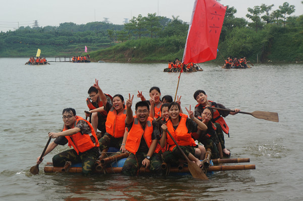 雨勢轉(zhuǎn)小,在教練的指導(dǎo)下各組開始挑戰(zhàn)搶灘登陸。每個(gè)隊(duì)伍利用有限的資源,克服下雨和泥濘,在規(guī)定時(shí)間內(nèi)扎好竹筏并通過水域,雖然磕磕碰碰,但最后都成功奪旗,安全返航。