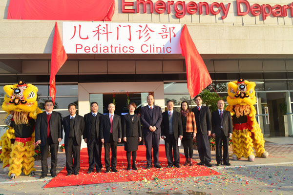 院領(lǐng)導(dǎo)揭開新醫(yī)院兒科門診部牌匾。