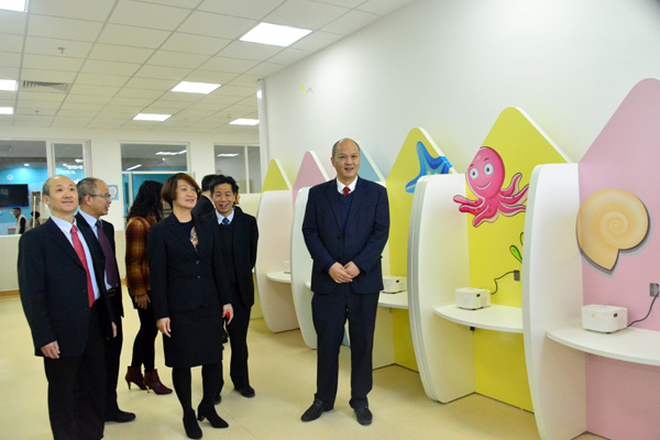 劉映南書記(右一)等院領(lǐng)導(dǎo)檢查新醫(yī)院兒科門診部環(huán)境。