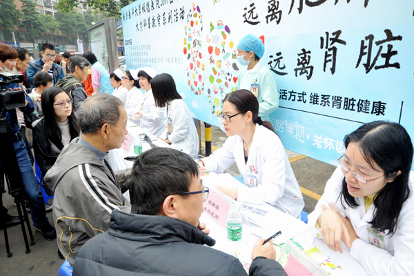 當(dāng)天上午,醫(yī)院腎內(nèi)科派出了20多名醫(yī)護(hù)人員,為群眾進(jìn)行免醫(yī)療咨詢、體檢,并開展了腎臟病健康飲食講座。