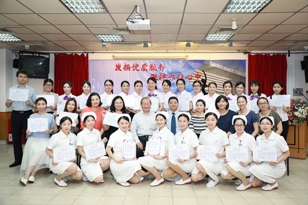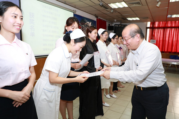 精彩的成果展現(xiàn)后,由陳嘉瑩護師代表學(xué)員致辭,各專家評委進行點評。周大為董事長為梁恩娜等10位特優(yōu)服務(wù)禮儀種子頒發(fā)榮譽證書,許小兵副院長為獲得服務(wù)禮儀成果發(fā)布特優(yōu)獎的“四海八荒”組頒發(fā)榮譽證書。