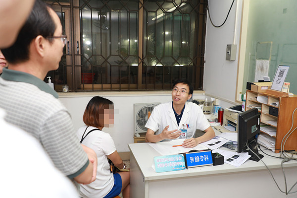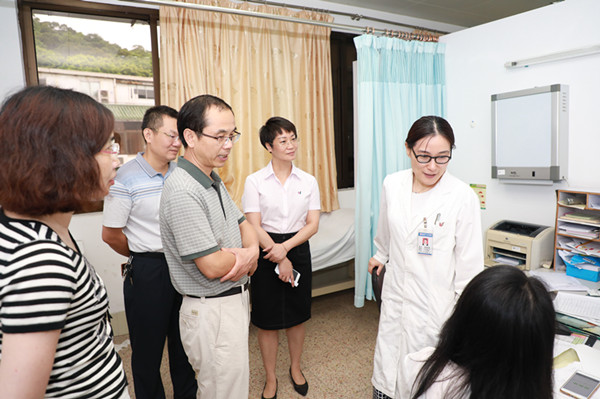 佛山市衛(wèi)計(jì)局副局長楊博(左二)在順德區(qū)衛(wèi)計(jì)局副局長李子慶(右一)、我院副院長鐘劍萍(右二)、劇永樂(左一)及相關(guān)職能科負(fù)責(zé)人的陪同下視察門診。