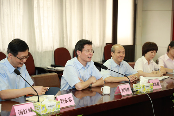 ??????? 為進(jìn)一步推進(jìn)我院藥物Ⅰ期臨床試驗(yàn)病房建設(shè),拓展雙方合作深度,加快合作發(fā)展速度,8月23日上午,南方醫(yī)科大學(xué)藥學(xué)院的劉叔文院長、何沐蓉書記、龐建新主任,學(xué)校資產(chǎn)經(jīng)營公司的遲德彪總經(jīng)理、肖國強(qiáng)助理以及學(xué)??蒲刑巺^(qū)采文副處長等一行6人來我院進(jìn)行考察交流,我院劉瑞林院長、龍兆麟副院長、劇永樂副院長以及相關(guān)部門的負(fù)責(zé)人給予了熱情的接待。