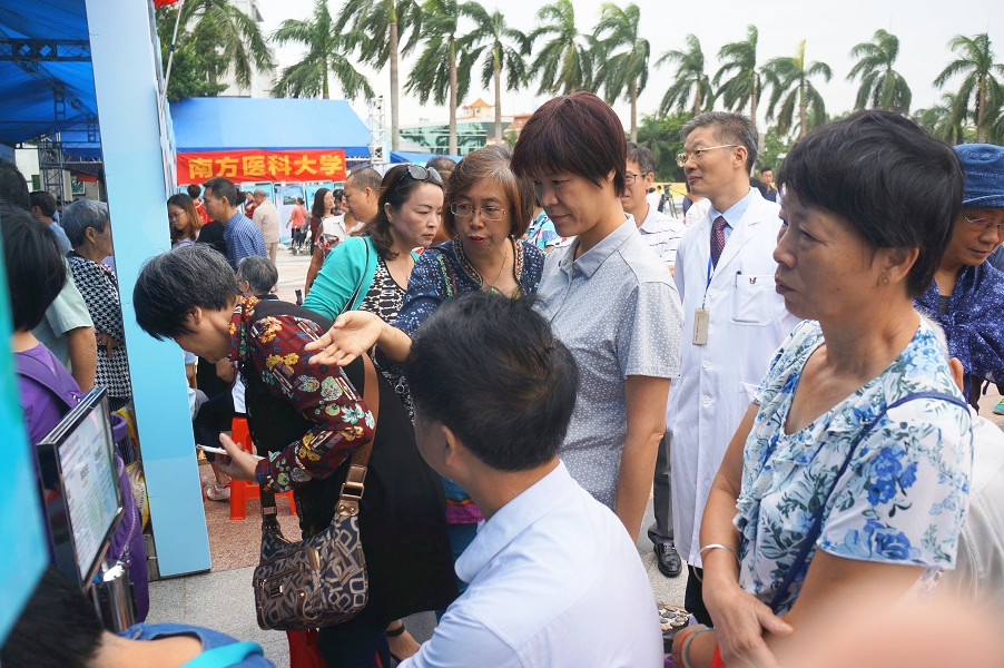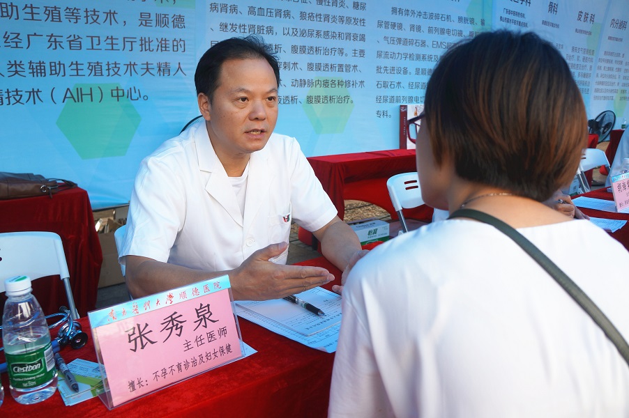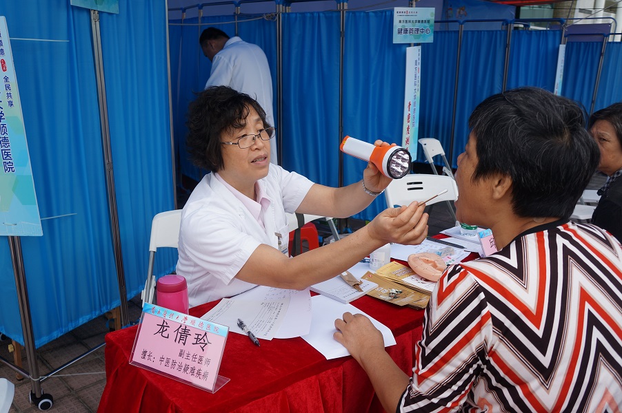 順德區(qū)副區(qū)長招霞紅、順德區(qū)衛(wèi)生和計劃生育局副局長葉少紅到我院義診展位前了解情況。