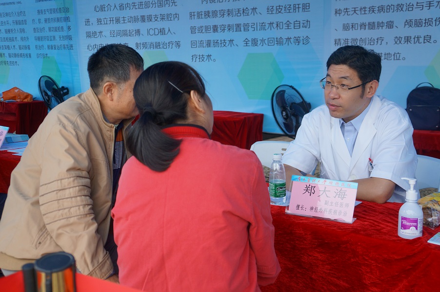 ???????今年55歲的莫先生在義診現場找到了我院神經外科鄭大海博士,他自述會突然昏厥,暈倒后能自行醒過來,有腦血管梗塞、腦萎縮病史,卻一直強調“我就是睡不好導致的”。鄭大海強烈建議莫先生到醫(yī)院做詳細檢查,苦口婆心勸他重視起來,“義診除了咨詢常見病,還能引導人們對一些出現早期癥狀的潛在嚴重疾病加以重視?!编嵈蠛Uf。他是我院新引進的高層次人才之一,是神經外科專家,擅長腦部腫瘤診治、腦血管介入治療手術、顱內微創(chuàng)手術治療等。