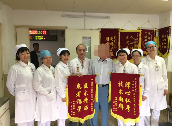 懷著對我院醫(yī)護工作者高尚的醫(yī)德及人文關(guān)懷的感激之情,梁伯在寄出感謝信后,于17日再次來到醫(yī)院第一門診部,特意送來兩面錦旗,以表心中的謝意。