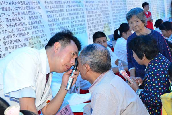 劉瑞林院長(zhǎng)(前左一)在義診現(xiàn)場(chǎng)聽(tīng)取專(zhuān)家和群眾的心聲。