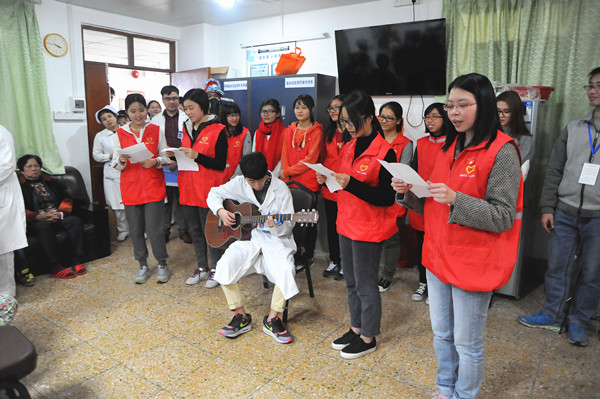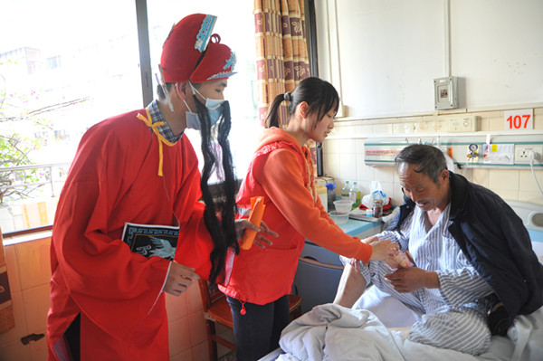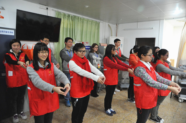為順利義演,活動開始之前,志愿者們就進行了義演節(jié)目的彩排,包括學(xué)習(xí)手語舞以及合唱歌曲。一支名為“讓愛傳遞出去”的手語舞蹈,拉開義演的序幕,舞蹈淳樸卻溫暖人心,讓愛心傳遞給患者;合唱一首“海闊天空”,鼓勵患者要堅定信念,積極配合治療,早日康復(fù)出院。最后,醫(yī)務(wù)社工扮演“財神爺”為患者和醫(yī)護人員送上了新年小禮品。