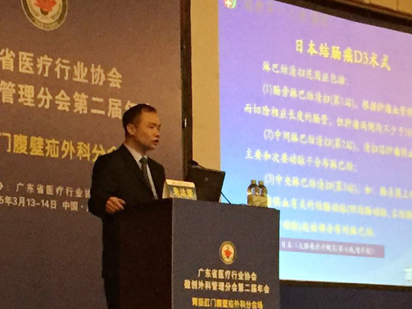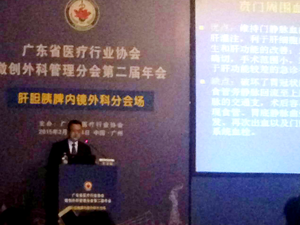 我院朱達堅教授在論壇上作了“結(jié)腸癌腹腔鏡規(guī)范化手術(shù)的思考”、劇永樂教授作了“3D可旋轉(zhuǎn)腹腔鏡系統(tǒng)在低位直腸癌根治術(shù)中的應(yīng)用”、王衛(wèi)東教授作了“3D腹腔鏡經(jīng)胃前、后雙入路選擇性賁門周圍血管離斷術(shù)”等專題學(xué)術(shù)報告。
