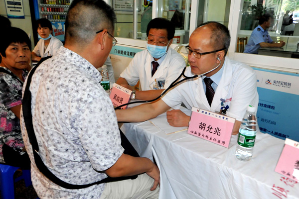 我院胡允兆教授(右一)、吳焱賢教授(右二)等專家熱情為群眾義診。