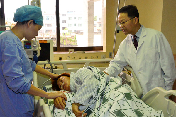 11月12日,胡允兆副院長(zhǎng)(左二)、吳焱賢主任(左一)在查看梁女士康復(fù)情況。