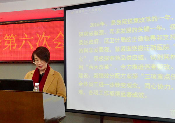 鐘劍萍院長以《與時(shí)俱進(jìn) 銳意改革 譜寫醫(yī)院發(fā)展新篇章》為題,對醫(yī)院2016年工作做了全面總結(jié);龍兆麟副院長向全體代表報(bào)告了2016年醫(yī)院財(cái)務(wù)決算、員工分配情況及2017年財(cái)務(wù)預(yù)算;劉映南書記在大會(huì)上提出了2017年工作目標(biāo)和計(jì)劃,同時(shí),就全院職工前期提出的問題作了回復(fù)。