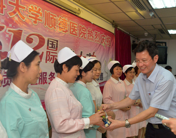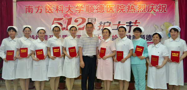 區(qū)衛(wèi)計局李子慶副局長(右六)為我院獲順德區(qū)“優(yōu)秀護士”的個人頒獎。