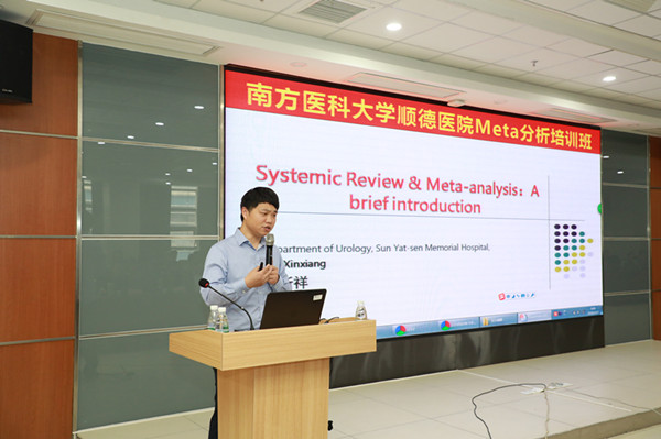 ??????? 為營造醫(yī)院科研學術氛圍,激發(fā)醫(yī)護人員的科研積極性,提高臨床研究設計的質量和發(fā)表高水平科研論文的能力,3月17-18日,我院邀請中山大學孫逸仙紀念醫(yī)院范新祥博士來院授課,成功舉辦首屆Meta分析培訓班,劇永樂副院長、科教科林勁松主任出席了培訓班,170多名科研人員參加培訓。