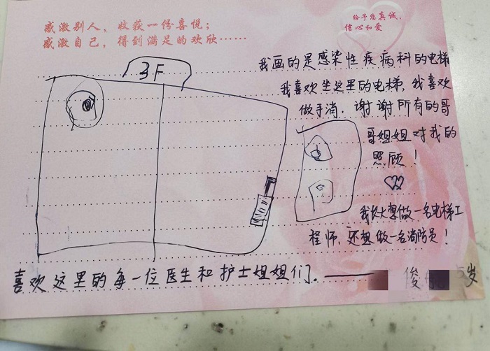 俊俊媽媽深受感動,緊握著李靜護長的手表示感謝,然后拿出一面錦旗,讓俊俊親手送給醫(yī)護人員。俊俊還親手畫了一幅畫,由媽媽代筆寫下了自己對感染性疾病科醫(yī)護人員的尊敬和喜歡。