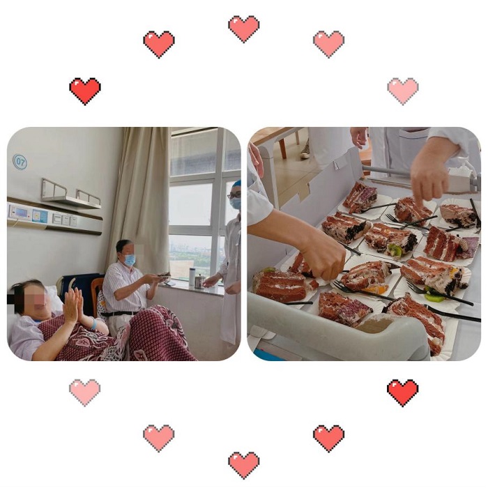 5月20日,朋友圈里滿屏“幸福”,胸外科病房里也洋溢著幸福的歡喜。醫(yī)護人員專門買來蛋糕,細心挑選出病情穩(wěn)定、血糖正?;颊?,為大家送上一塊可口的蛋糕,送上早日康復的祝福,將“愛意”寄寓在甜蜜當中。