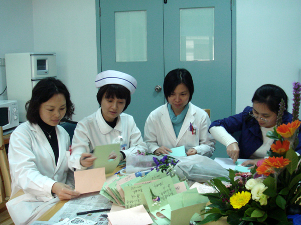 禮物并不一定貴重,只是為了表達我們對病人的心意,希望在節(jié)日這一天仍要住院的病人們也能得到一份驚喜,收獲一份祝福。護士長開心的說“咱們‘3.8’‘3.9’一起過,無論是男病人還是女病人,人人有份?!辈∪藗兪盏竭@份小小的祝福都很高興,特別是許多年長的女性病人,在收到賀卡時,對我們醫(yī)護工作人員感慨的說:“兒女都不記得慶祝的事情,想不到居然你們醫(yī)生護士還反倒記得了,讓我們這些老太婆也享受下過節(jié)的感覺!尤其是親手制作的賀卡,這禮物太珍貴了?!?BR> 整個節(jié)日,消化內(nèi)科都洋溢著一種歡樂的氣息,消化內(nèi)科的全體同事認為:“雖然自制賀卡費心思,也費時費工,但看到病人們的笑容,我們就覺得值得了!”