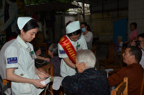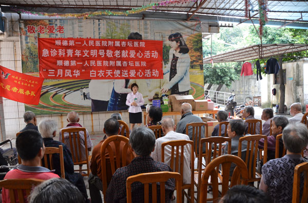 為弘揚中華民族尊老愛老的傳統(tǒng)美德,展示青年團員文明風采。4月13日下午3點,我院附屬杏壇醫(yī)院急診科醫(yī)務(wù)人員志愿者一行來到杏壇敬老院開展“急診科青年文明號敬老顯愛心”活動。杏壇醫(yī)院急診科姚護長簡要介紹了活動流程并向全體老人送上全院醫(yī)務(wù)人員的良好祝愿。