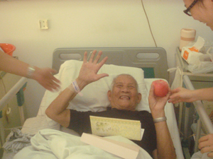 77床的阿姨已經(jīng)臥病在床1個(gè)多月了,平時(shí)因?yàn)樽优ぷ鞅容^忙碌,難得有時(shí)間陪老人家聊天。在重陽(yáng)節(jié)這個(gè)歡樂(lè)的節(jié)日里,感染科的醫(yī)務(wù)人員和老人家一起吃著水果,聊著家常,陪老人家度過(guò)一個(gè)充實(shí)、快樂(lè)的一天。當(dāng)我們離開(kāi)病房的時(shí)候,老人家緊緊拉著姑娘們的手說(shuō):“真希望日日都是節(jié)日,希望天天都有那么多人陪自己聊天”。