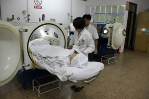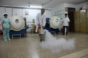 平靜的高壓氧艙內(nèi),例行的治療正在進(jìn)行著。突然,高壓氧艙冒出了一股濃煙。值班人員立即拿起電話報警通知相關(guān)部門,然后迅速打開排氣閥和緊急減壓閥門等減壓裝置,快速減壓,切斷總電源、供氧、供氣閥門關(guān)閉并且打開應(yīng)急補(bǔ)氣系統(tǒng),并通過語音系統(tǒng)通知氧艙內(nèi)“病人”不要驚慌,穩(wěn)定住“病人”情緒,科主任接到報警后,立即啟動科室應(yīng)急救援預(yù)案,組織到場的醫(yī)護(hù)人員立即開展轉(zhuǎn)移患者的救援工作。然后被順利轉(zhuǎn)移到安全地帶。在同一時間內(nèi),由保安組成的滅火組,迅速利用現(xiàn)場的滅火器材,趕到高壓氧艙進(jìn)行滅火,將火勢撲滅。到此緊張而有序的高壓氧艙消防演練結(jié)束了。
