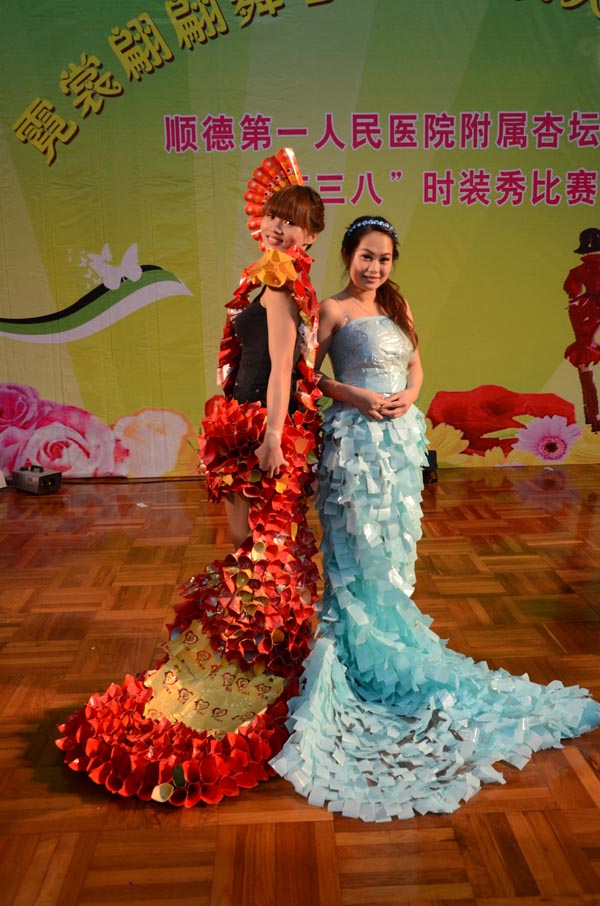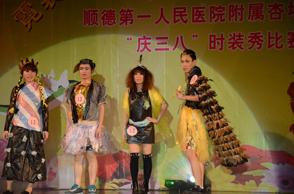 經(jīng)過激烈角逐,最終由急診科、醫(yī)技組并列一等獎;行政職能、外科、兒科、麻醉供應(yīng)室聯(lián)隊獲二等獎;婦產(chǎn)科、內(nèi)一科、藥劑科、骨科、內(nèi)二科、五官科獲三等獎。“最佳服裝設(shè)計獎”的桂冠花落行政職能部門。本次環(huán)保時裝秀豐富了附屬杏壇醫(yī)院員工的精神文化生活,充分展現(xiàn)了白衣天使心靈手巧、青春、活力、時尚的另一面風(fēng)采,同時提高了員工的環(huán)保意識和創(chuàng)新意識,更好地展現(xiàn)了新時期醫(yī)務(wù)工作者良好的文明素養(yǎng)和精神風(fēng)貌。