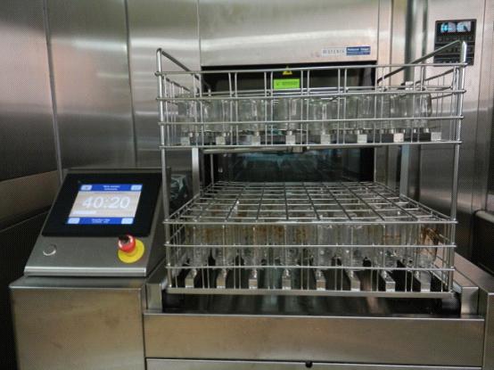新生兒的奶瓶是玻璃材質(zhì),奶瓶的清洗方法并不是我們所知道的用刷子放些洗潔精刷洗后再用自來水沖干凈這么簡單,到了消毒供應(yīng)中心,這項(xiàng)神圣的任務(wù)當(dāng)然是交給我們科新進(jìn)的長龍清洗消毒機(jī)(Vision)來擔(dān)當(dāng)?shù)牧?。首先,消毒供?yīng)中心護(hù)士和工程師精心設(shè)計(jì)了二個(gè)多層的奶瓶清洗消毒擺放架,清洗前將奶瓶一個(gè)個(gè)倒插在噴水管上,發(fā)現(xiàn)有未溶解的奶跡時(shí)先沖洗再插上去。然后,清洗架經(jīng)過識(shí)別碼掃描自動(dòng)進(jìn)入全自動(dòng)清洗消毒機(jī)vision內(nèi),選擇奶瓶清洗消毒程序,奶瓶會(huì)全自動(dòng)地經(jīng)過沖洗、堿性清洗液洗滌、超聲清洗(選用)、漂洗、純水漂洗、干燥的規(guī)范洗滌流程,在洗滌過程中還接受了90℃5分鐘的熱漂洗,A0值達(dá)到3000的熱力消毒。洗滌后的奶瓶個(gè)個(gè)晶瑩剔透,干干爽爽,拿在手里暖暖的,給人一種特別溫馨的、特別放心的感覺。最后由專業(yè)人員對奶瓶進(jìn)行洗滌質(zhì)量檢查和包裝,再經(jīng)過壓力蒸汽滅菌,達(dá)到了100%的洗滌合格、包裝合格、滅菌合格。