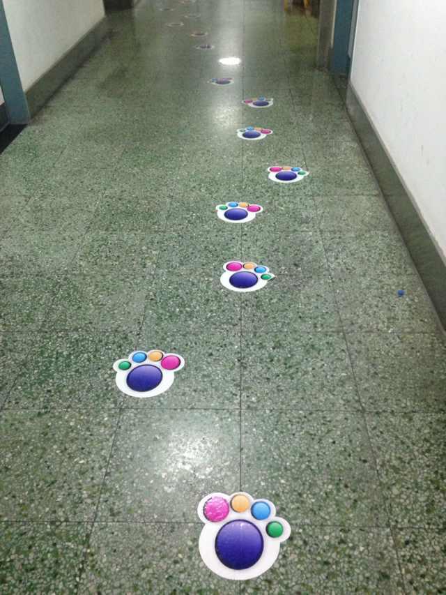 直到今年三月外出游玩,看到一家著名游樂場(chǎng)所貼在地上的大腳印,想到科室路標(biāo)指示不清的現(xiàn)狀:同事們有時(shí)因?yàn)檎诠ぷ髅]講清楚診室在哪;患者及家屬?zèng)]聽清楚工作人員的詳細(xì)復(fù)雜的回答……這些現(xiàn)狀不論是對(duì)患者,家屬,還是醫(yī)生護(hù)士都會(huì)造成一定的困擾。頓覺這種路標(biāo)指引方法清晰、明了,結(jié)合科室的特殊性,覺得非常適合做為感染性疾病科的地面指引。