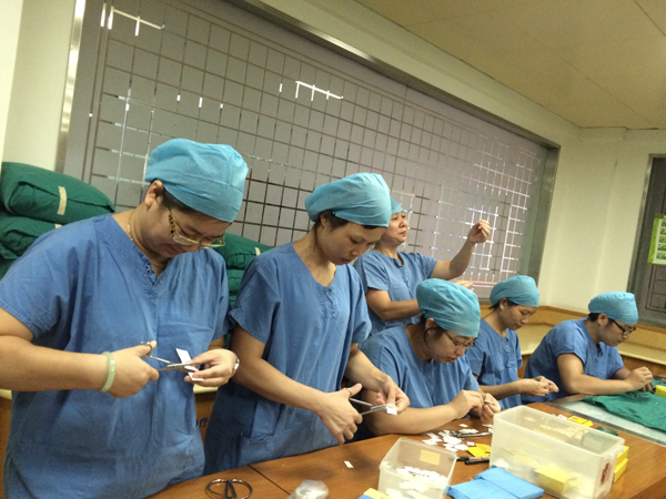 以前,臨床醫(yī)生曾反映縫合包里的縫線經(jīng)高溫滅菌后容易斷,希望能用手術(shù)室的那種好質(zhì)量的針線。為了滿足臨床醫(yī)生的需要,又能節(jié)約成本,消毒供應(yīng)中心主動開始了穿好針線獨立包裝低溫滅菌針線包的服務(wù),但是要滿足所有臨床科室包括口腔中心、五官科仍至手術(shù)室部分手術(shù)的需要,平均每天要穿好幾十個縫針,并把縫線盤好在小紙卡上,包裝好,貼上標(biāo)簽,工作量大,談何容易啊。為此,消毒供應(yīng)中心人員養(yǎng)成了見縫插針一有空就去穿針線的習(xí)慣,眼力好的年青人負(fù)責(zé)穿針,年齡大的做下手負(fù)責(zé)繞線。實在忙不過來,針線供應(yīng)不上來時,多個員工偷偷將針線帶回家里抽空做!在大家的努力下,我們的針線包供應(yīng)從未間斷過。