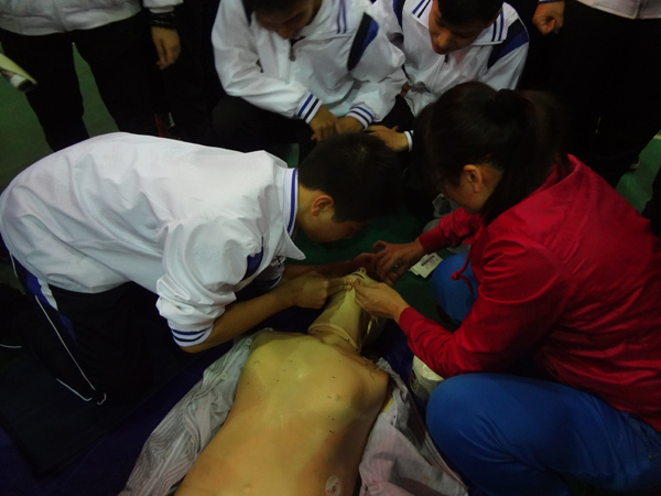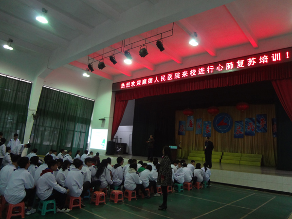 通過(guò)聯(lián)系,12月份,重癥醫(yī)學(xué)科一行來(lái)到了羅定邦學(xué)校。本次活動(dòng)得到了羅定邦校領(lǐng)導(dǎo)的大力支持。學(xué)生們也都非常踴躍的參加。原本只針對(duì)高二年級(jí)的40多個(gè)學(xué)生培訓(xùn),高一年級(jí)的同學(xué)知道這個(gè)消息后也都非常期望參加,最后總共有80多名學(xué)生參加了本次心肺復(fù)蘇術(shù)的培訓(xùn)。我們采用理論與實(shí)踐相結(jié)合的培訓(xùn)方法,首先通過(guò)幻燈片來(lái)講解基本知識(shí)和操作方法,然后分兩個(gè)場(chǎng)地實(shí)際演練。演練完之后就指導(dǎo)學(xué)生實(shí)際操作,爭(zhēng)取讓他們?cè)诙虝r(shí)間內(nèi)對(duì)心肺復(fù)蘇知識(shí)有一個(gè)簡(jiǎn)單的了解并會(huì)進(jìn)行簡(jiǎn)單的操作。培訓(xùn)完之后,還有許多學(xué)生感覺(jué)練的不好,我們又分別一一指導(dǎo)。很多學(xué)生都說(shuō)以后也想讀醫(yī)科學(xué)校,做一名優(yōu)秀的白衣天使。