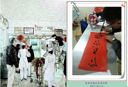 為了讓他們過(guò)年住院也有家的感覺(jué),在科室主任和護(hù)士長(zhǎng)帶領(lǐng)下,我們一起美化科室。有家屬自愿的加入了我們的活動(dòng),那句:小妹,下來(lái)吧,等我來(lái),太高了。依然感動(dòng)著我們。“我會(huì)書(shū)法,讓我來(lái)寫(xiě)對(duì)聯(lián)”另外一個(gè)家屬也很積極的參與上,然后當(dāng)你走進(jìn)2號(hào)樓5樓,你會(huì)看到“妙手回春醫(yī)天下,藥到病除濟(jì)世人,橫批是仁心仁德”。整個(gè)科室充滿了春節(jié)氣氛,那是醫(yī)患合作的結(jié)果,過(guò)個(gè)開(kāi)心年,是大家的共同心愿。