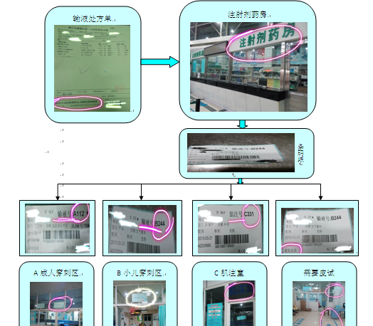 醫(yī)生開具處方單后,先到一樓門診大廳收費處繳費,然后注意留意處方單下方黑色加粗斜體的字“請先到注射劑藥房”。把處方單交到注射劑藥房后,藥房會提供一張條碼紙給你,這就表明你已經(jīng)在排號等候輸液了,而這張條碼紙是你輸液的身份憑證,一定要保管好。拿到這張條碼紙,留意條碼紙上的信息,上面有你的姓名,年齡,電話等個人信息,此外還要留意上面其他信息。如你需要皮試的話,上面會提示你,需要皮試,此時你應(yīng)到皮試等候區(qū)等待叫號。如上面是A109,A提示你應(yīng)該到成人穿刺區(qū)(1,2,3號位)等候叫號,109提示你是第109個輸液,穿刺完成后,到成人輸液室輸液觀察。如上面是B099,B提示你應(yīng)該到小兒穿刺區(qū)(7,8,9號位)等候叫號,099提示你是第99個輸液,穿刺成功后到小兒穿刺區(qū)輸液觀察。如上面是C023,C提示你應(yīng)該到肌注室等候叫號,023提示你是第23個肌注。