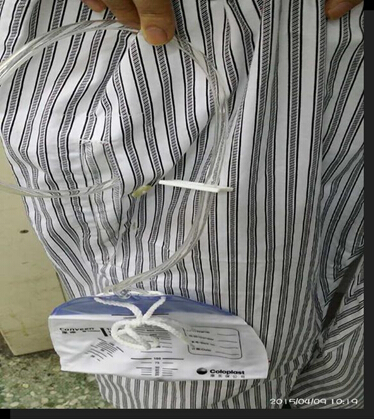 為此,我們普外一發(fā)揮頭腦風暴,精心設計了導管褲,適用于行導尿術的病人,同時也適用于行留置肛管接袋的病人。這種褲子特征是在大腿側開10cm左右的縫隙,使引流袋可以從側放出,也可以將引流袋掛于紐扣上,有別于普通的褲子要將引流袋從褲頭腰間放出。