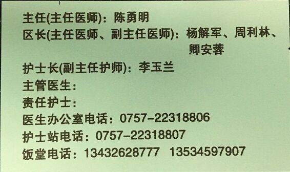 小卡片上有主任、護(hù)長(zhǎng)以及區(qū)長(zhǎng)的名字。如果住院期間有任何問(wèn)題,隨時(shí)可以向他們提出。其次,會(huì)有主管醫(yī)生和主管護(hù)士的名字。這樣就避免了病人到處詢問(wèn)自己的主管醫(yī)生,也能及時(shí)找到自己的主管護(hù)士。再次,有護(hù)士站和醫(yī)生辦公室的電話,這樣方便病人出院后,如果有什么問(wèn)題,可以及時(shí)與主管醫(yī)生溝通。最后,還有飯?zhí)秒娫?,方便病人隨時(shí)打電話到飯?zhí)糜啿汀?/span>